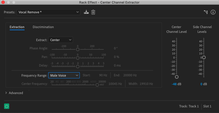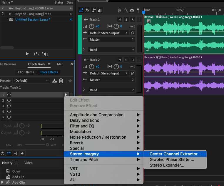 Now we select Track 1, and in the Effects Rack on the left, we choose Stereo Imagery -> Central Channel Extractor.