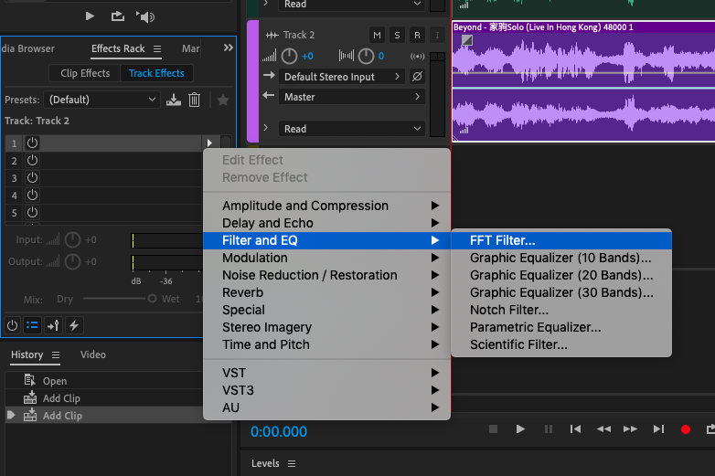 Now let us move on to Track 2. In the Effects Rack on the left, we choose Filter and EQ -> FFT Filter.