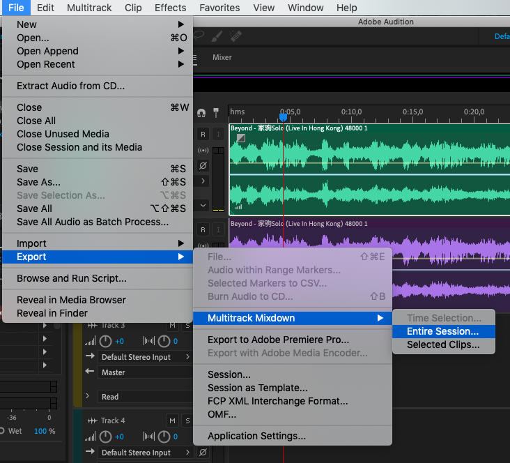 And now we are done with the repair work. To get the edited audio file, we go to File -> Export -> Multitrack Mixdown -> Entire Session, and then save the edited file.
