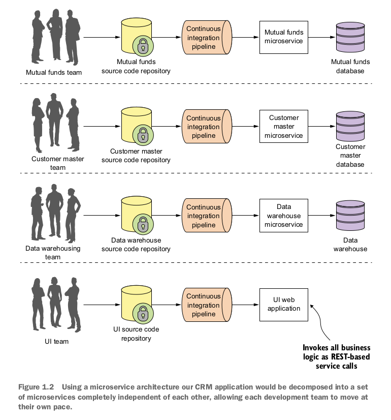 - Small development teams, and each team completely owns their service code and infrastructure.