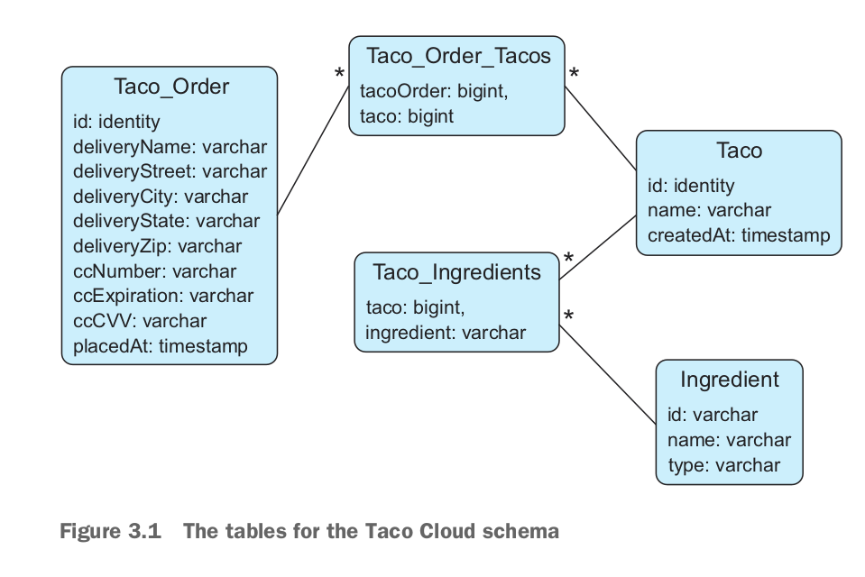 @ManyToMany(targetEntity=Ingredient.class) @Size(min=1, message="You must choose at least 1 ingredient") private List<String> ingredients; private Data createdAt; // set createdAt to the current time before Taco is persisted @PrePersist voidcreatedAt(){ this.createdAt = new Date(); } }