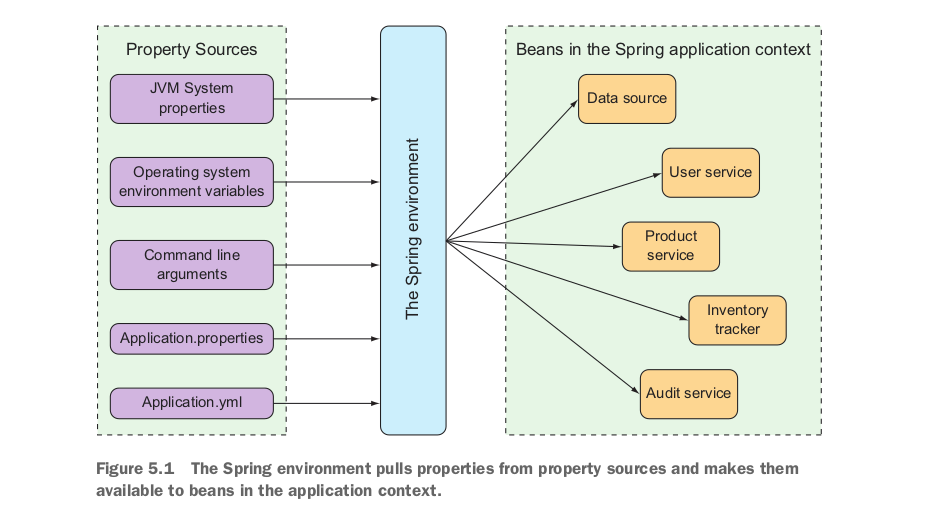 The Spring environment abstraction abstracts the origins of properties, so that beans can consume properties from Spring itself. Spring pulls from several property sources, then aggregates those properties into a single source from which Spring beans can be injected.
